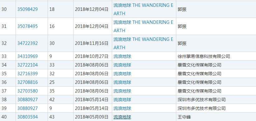 小编在中国商标网上查询流浪地球商标发现,目前包含“流浪地球”(中文和英文)的商标数量共有41个,涵盖了32个类别。