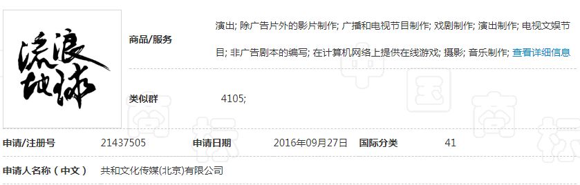 经查询,最早提交注册“流浪地球”的共和文化传媒(北京)有限公司的法人是这部影片的导演郭帆。这家公司于2016年09月27日提出商标申请,主要涉出版娱乐等相关类别。