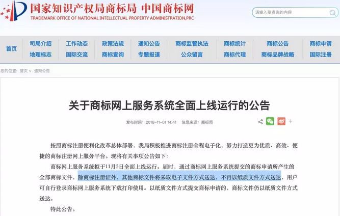 2018年11月5日,商标网上服务系统全面上线运行。通过商标网上服务系统提交的商标申请所产生的全部商标文件,除商标注册证外,其他商标文件将采取电子文件方式送达,不再以纸质文件方式送达,用户可自行登录商标网上服务系统下载打印使用。(以纸质文件方式提交商标申请的,商标文件仍以纸质文件方式送达。)