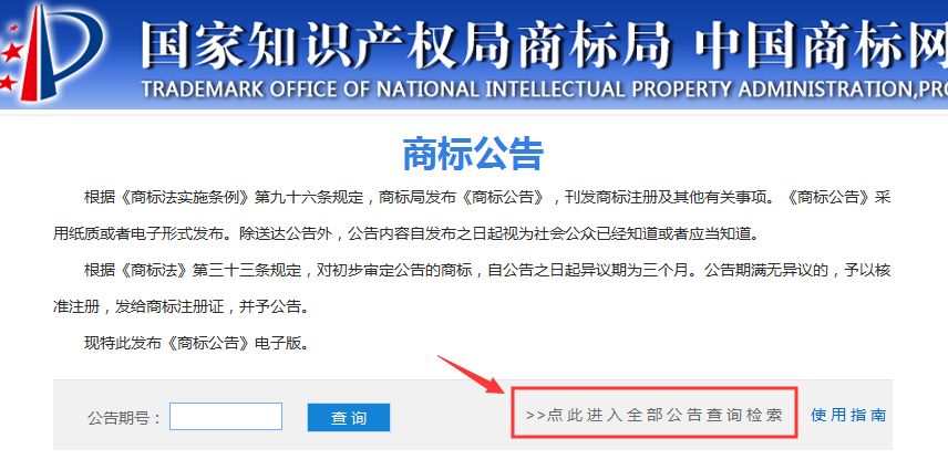 如果要查询具体商标的公告情况,可点击图中尖头指向的位置,进入全部公告查询检索。