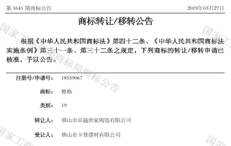 根据商标圈(shangbiao.com)商标交易监控: 转让人佛山市卓越世家有限公司,受让人佛山市卡登建材有限公司转让商标“雅格”(19类商标)。