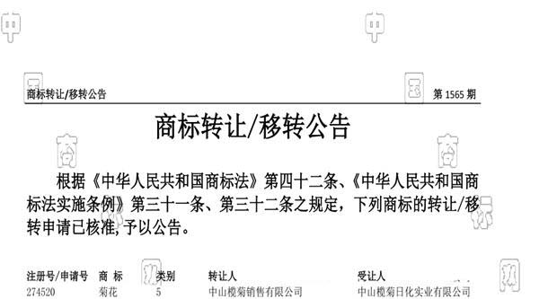 转让人中山榄菊销售有限公司受让人中山榄菊日化实业有限公司转让商标“菊花”(5类商标)。
