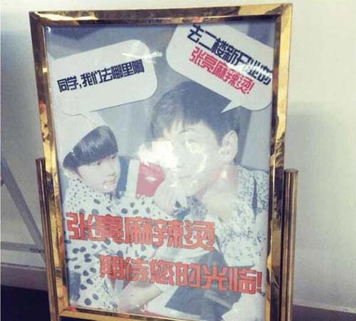 原来有人发现在内蒙古财经大学食堂某卖麻辣烫的在店门口用张亮和儿子的照片进行宣传。