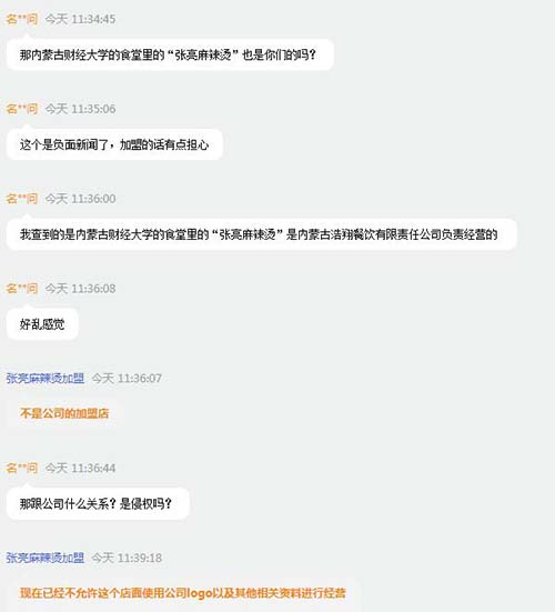 为什么说张亮起诉搞错了对象?据标哥经“张亮麻辣烫”官方客服求证,案件中的内蒙古浩翔餐饮有限责任公司此前只是“张亮麻辣烫”的加盟店,并非“张亮麻辣烫”的连锁店。