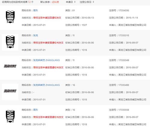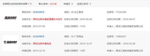 而且其公司还拥有“张亮”、“张亮麻辣烫”的商标所有权。其公司不仅将品牌“张亮”、“张亮麻辣烫”注册成了商标,还防御性的注册了“张亮麻辣”、“张亮麻辣烫 ZHANGLIANG”、图形“张亮”以及宣传语“我们不一样”等商标。